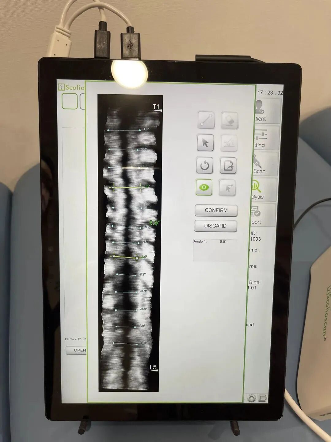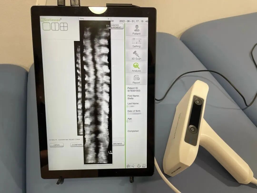 “我们有个新的仪器,扫一扫就能看到你的脊柱侧弯的情况,要不要试试?”