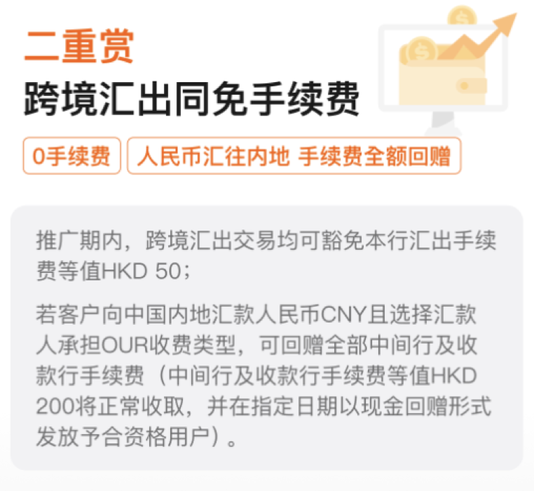 推广期内,跨境导出交易均可豁免本行导出手续费等值HKD 50。