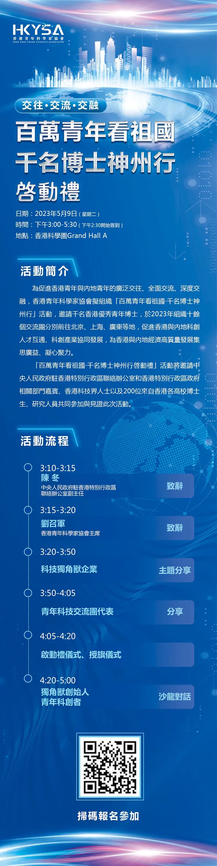 「百万青年看祖国•千名博士神州行」启动礼活动,将在5月9日周二在香港科学园举行。主要环节包括嘉宾致辞、青年科技交流团分享、活动短片观看、启动礼环节和授旗仪式。