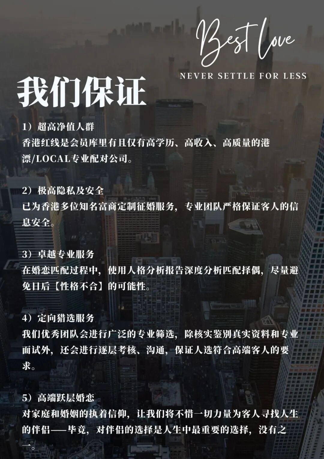 红线牵恋利用心理学,两性需求剖析和独特的技术匹配,为港漂在香港找到理想的另一半。提供高隐私度保障的一对一定制化配对,交友数据库深度匹配和线下活动,全面满足不同人群需求。通过线下咨询和线上算法匹配,比你更懂您自己的婚恋交友需求。