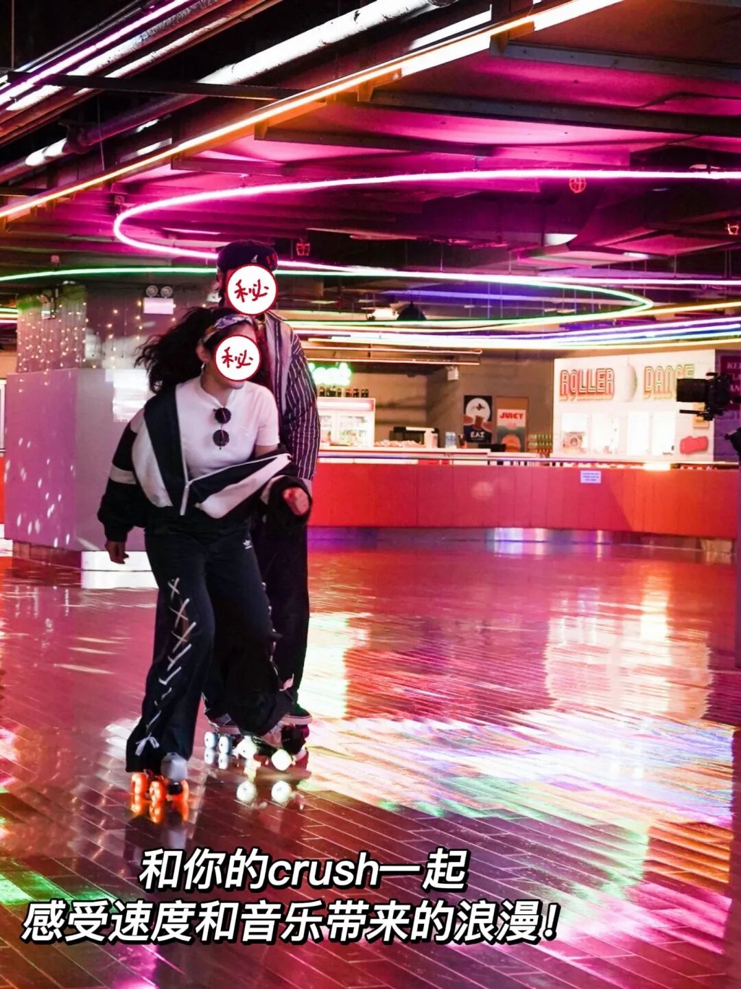 迷幻风的落地镜,霓虹灯墙面装饰,伴着复古的disco音乐拍照、喝饮料、滑轮滑,一周的烦恼和疲惫可以被迅速抛开!在溜冰场上,牵手也会变得顺理成章~不经意间的身体碰撞,让你也感受一把偶像剧中的浪漫,找回青涩美好的初恋悸动feel哦~