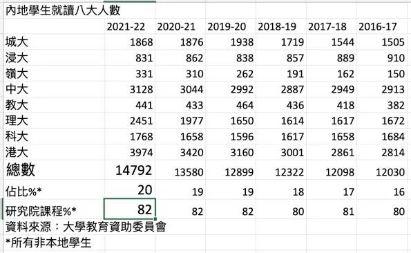 香港的官方数据显示,过去六年八大院校每年收录内地生的人数也持续攀升,升幅达到23%。