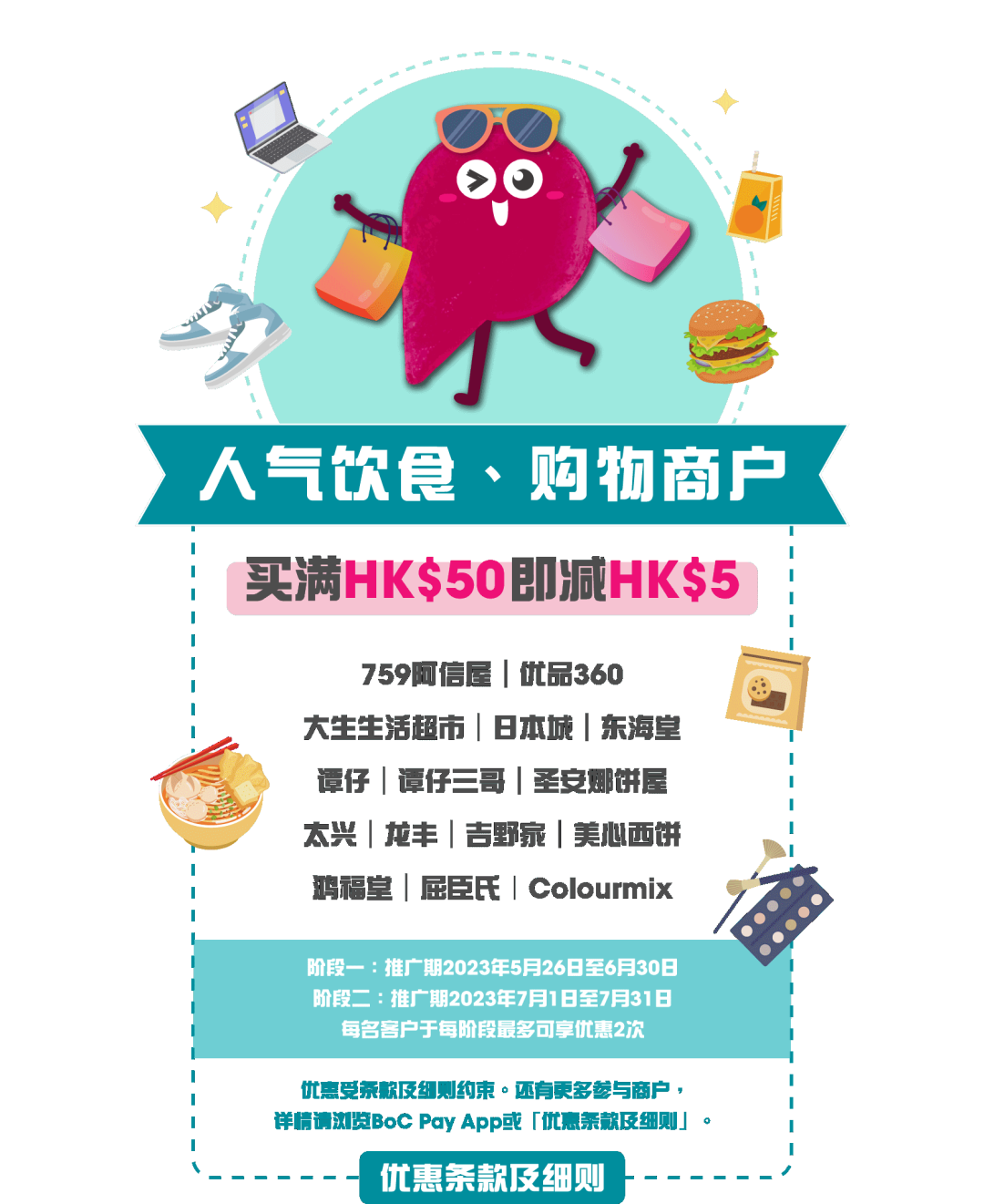最近,大家常去吃、常去买的这些商店,用BoC Pay付款满 50港元 立减5港元的优惠活动哦~