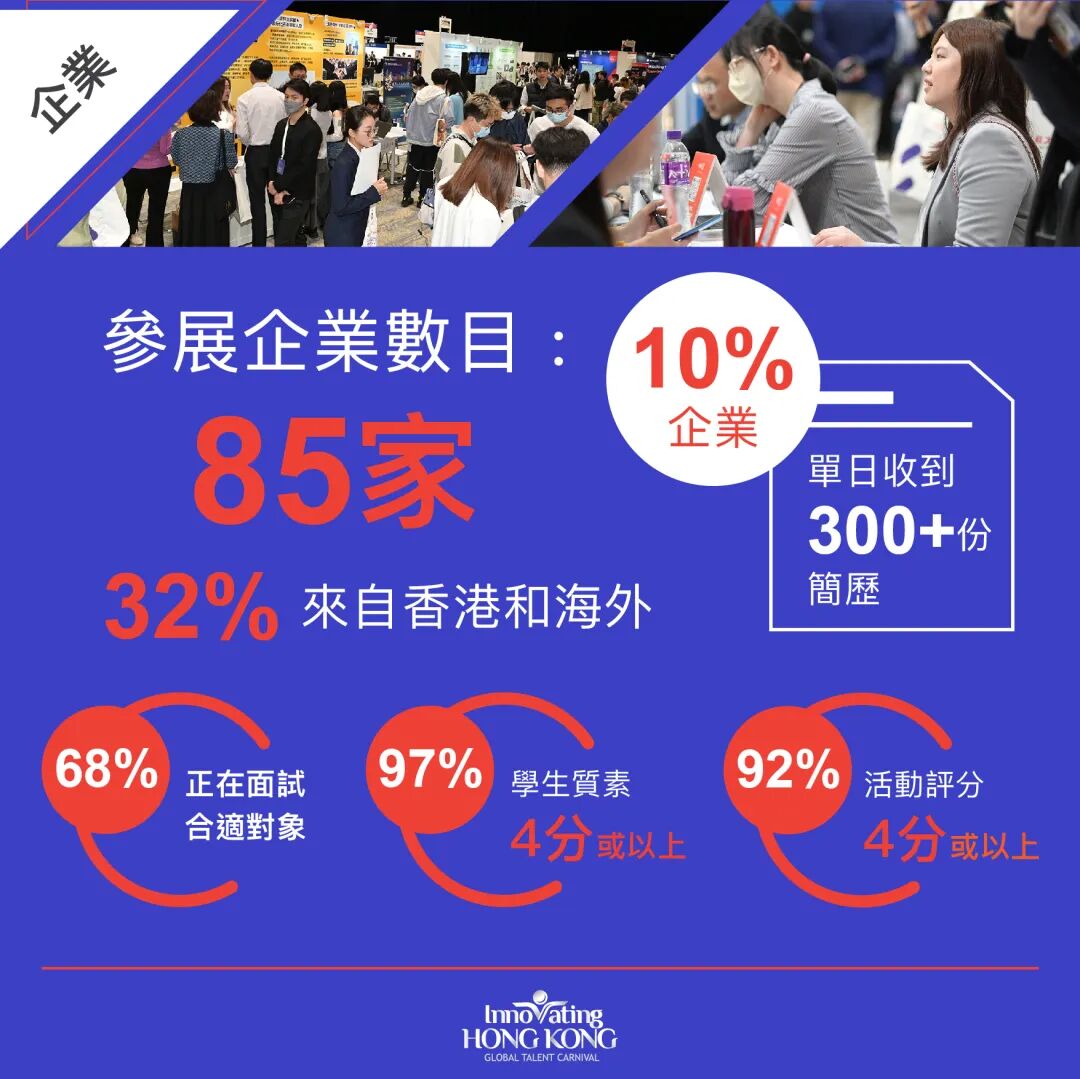 而企业方面呢,85家企业到场参与,其中有32%的企业是香港本地企业和海外企业,10%的参展企业一天收到了超过300份简历。