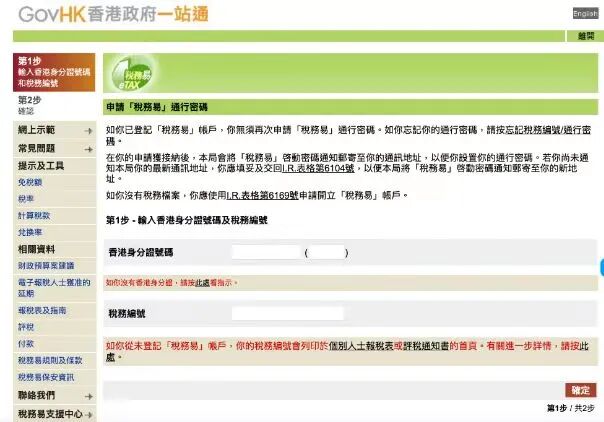 填写香港身份证以及税务编号(报税表中),即可获得报税通行密码。