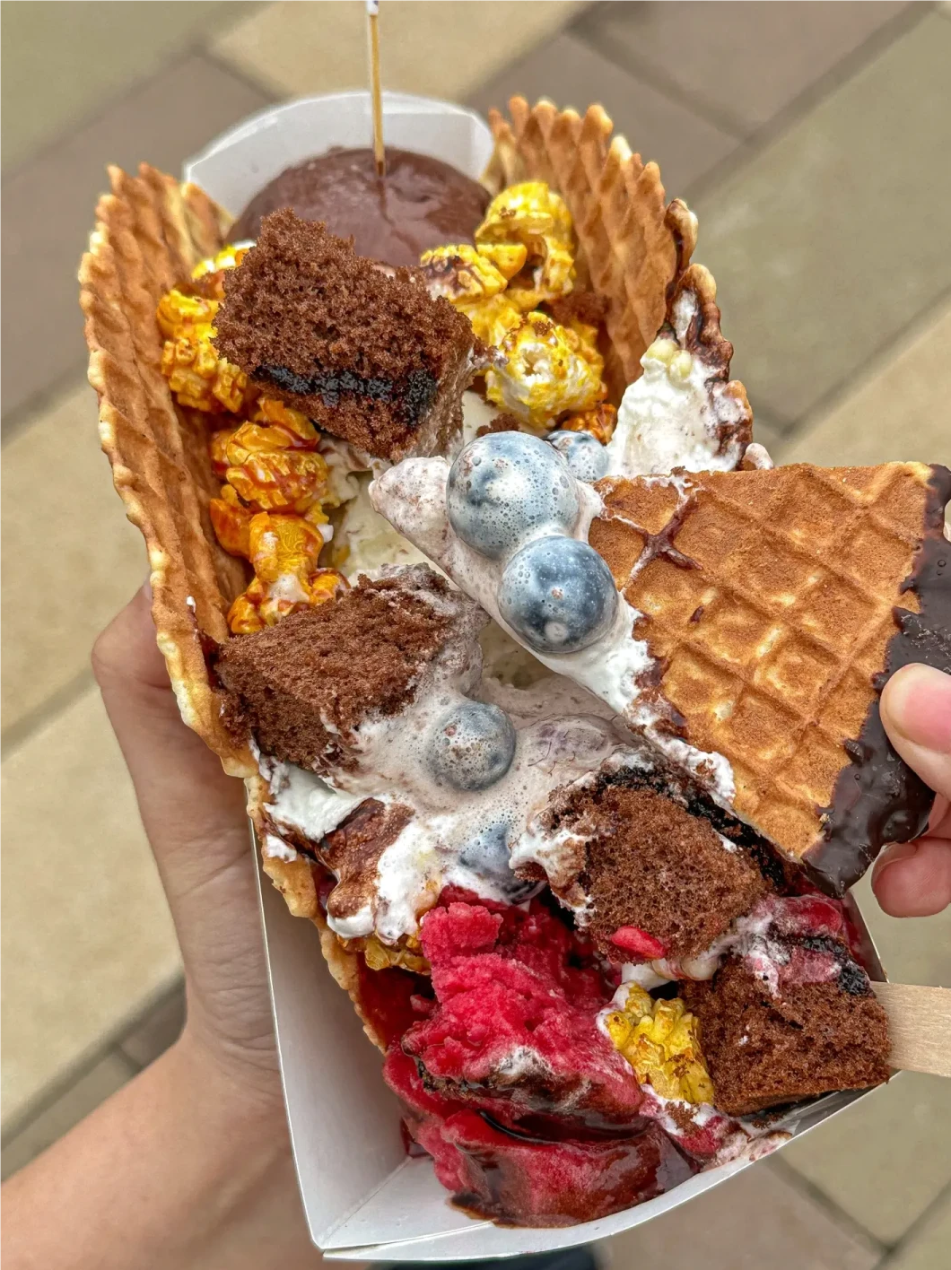位置在小小世界附近的雪糕亭,好看又大份的gelato雪糕船!饼皮都是现烤的,里面还有巧克力蛋糕爆谷和新鲜蓝莓,酸酸甜甜的很爽口!