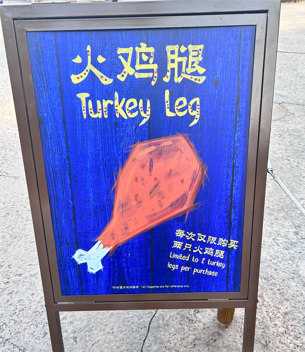 鸡腿太大里面容易没有味道,撒上孜然辣椒粉才是灵魂!比上海迪士尼的火鸡腿大了一倍,胃口小一点的,两个人根本吃不完,一顿吃完的姐妹,我敬你是个勇士!