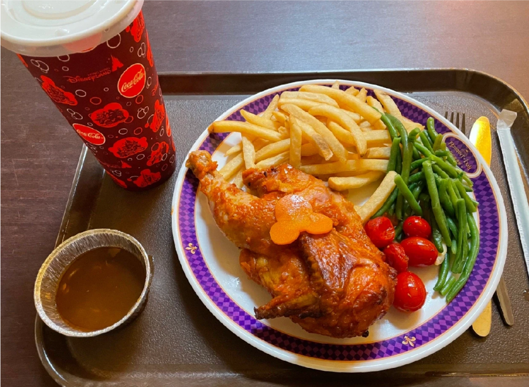 火箭餐厅的炸鸡篮套餐应该是园内价格最低的正餐了吧,炸鸡薯条+可乐,囊中羞涩的小伙伴选它就对了!
